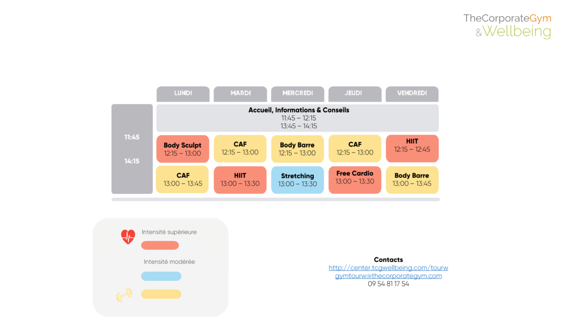 - Body sculpt : Cours cardio associé à un renforcement musculaire général.